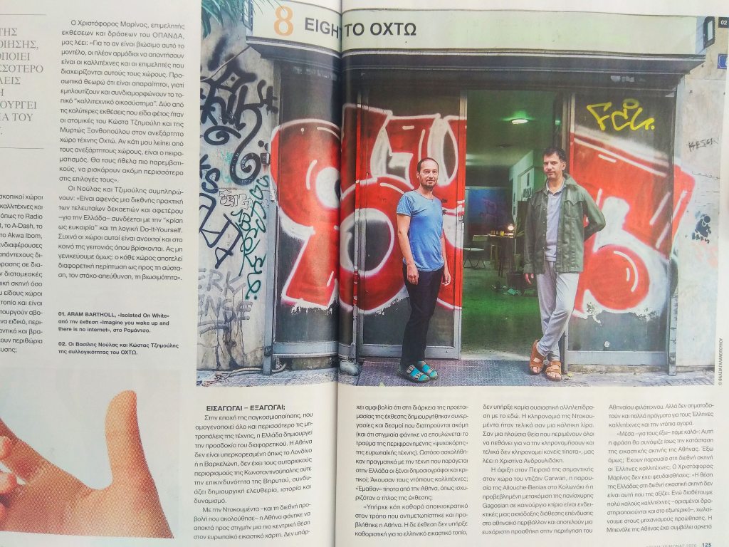 Vassilis Noulas & Kostas Tzimoulis interviewed by Dimitris Tsoublekas for his tribute to the Athenian art scene at the printed edition of daily newspaper I KATHIMERINI. The online english version at GREECE IS magazine under the title Rising, Again: Art in Athens