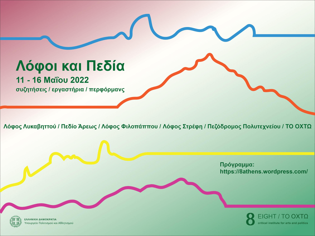 VASKOS (Vassilis Noulas & Kostas Tzimoulis) co-organize and co-curate together with Gigi Argyropoulou Hills and Fields, a peripatetic public program, with the support of Greek Ministry of Culture, at Filopappou Hill / Pedion tou Areos / Stefi Hill / Lycabettus Hill / Polytechnic Street / EIGHT critical institute for arts and politics, Athens, Greece.