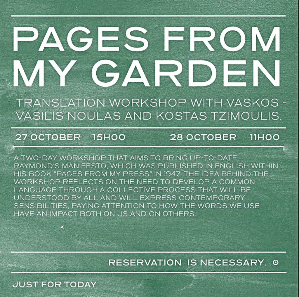 VASKOS (Vassilis Noulas & Kostas Tzimoulis) organize and conduct “Pages From My Garden”, a two-day workshop, in the framework of Just For Today festival, organized by PLANT (Performing Life Academia Network), Duncan Dance Research Center, Vironas, Greece