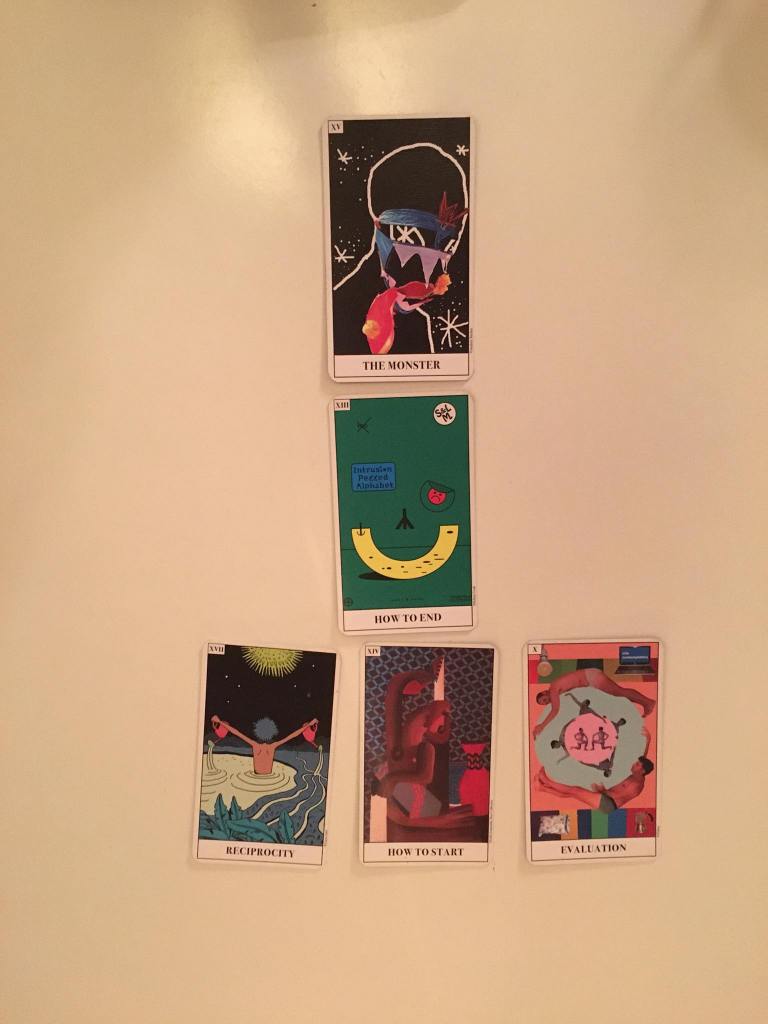 The tarot card designed playfully deals with the notions of mirroring, contemplating, revolving, turning around or turning upside down, constantly trying to create a new equilibrium and ways of evaluating. The number four is used to indicate balance, trust, openness to the cardinal directions. Four everyday objects as symbols for a good evaluation process: a coffee pot, a bed pillow, a light source, a laptop.