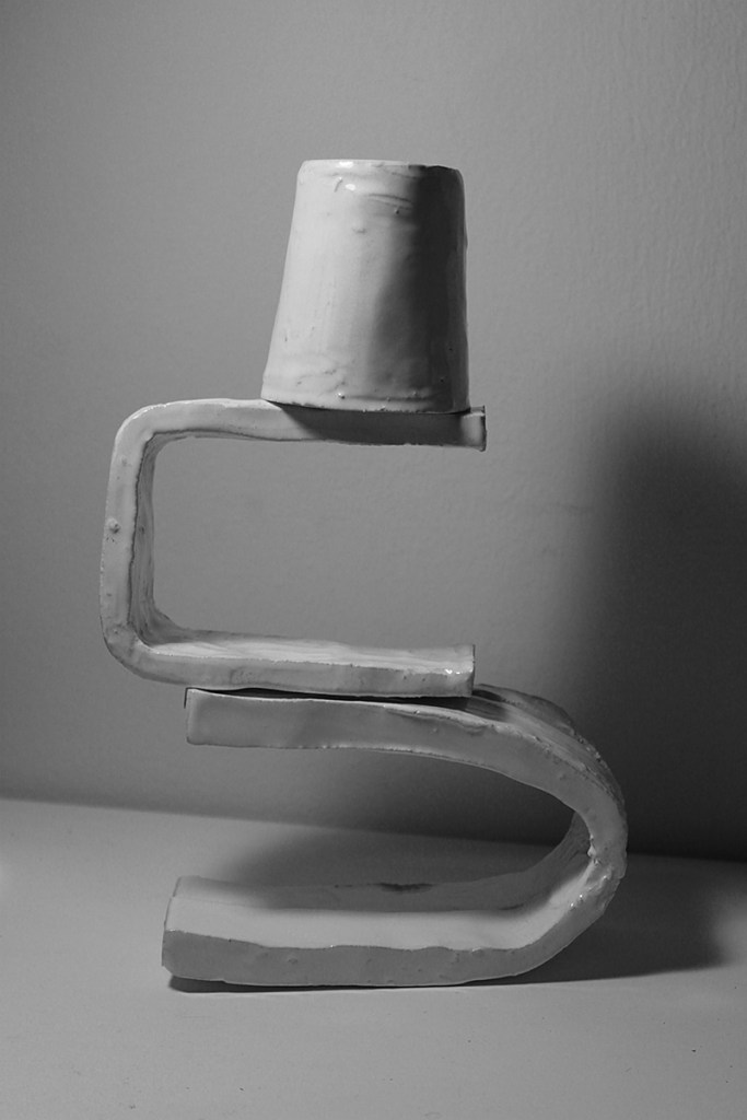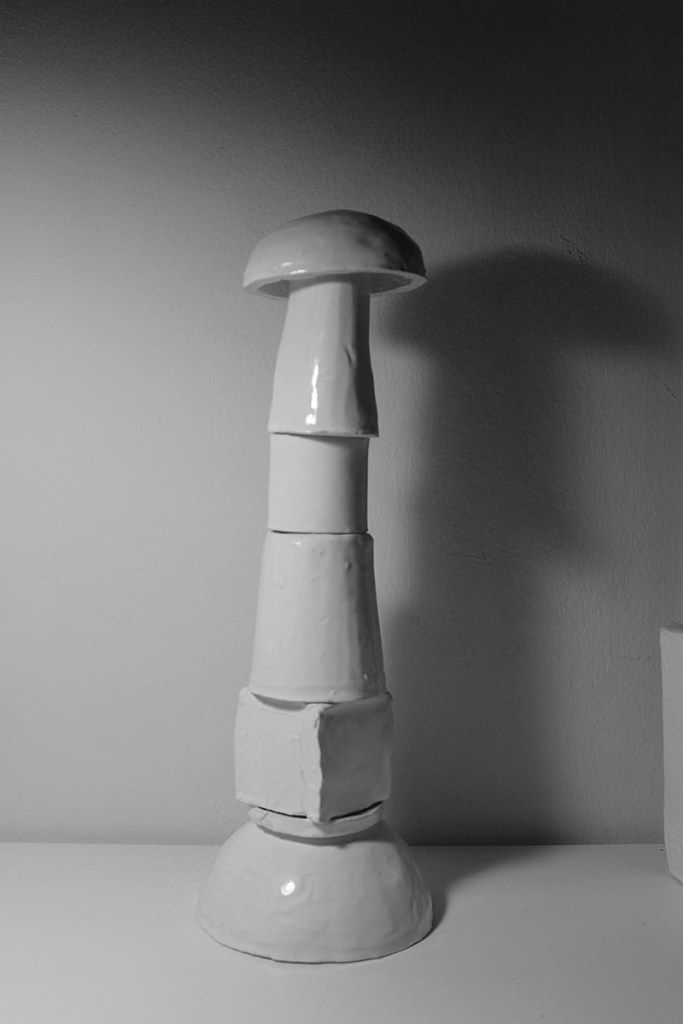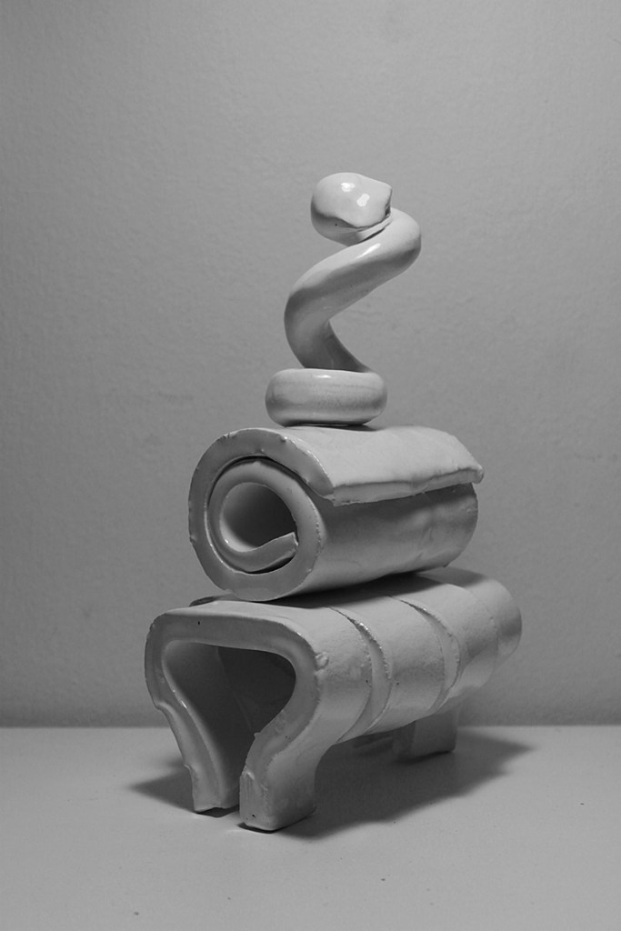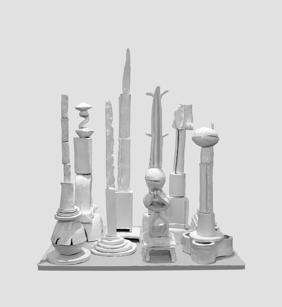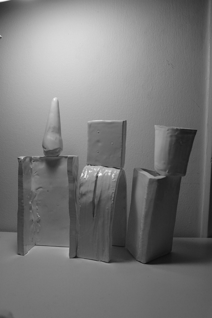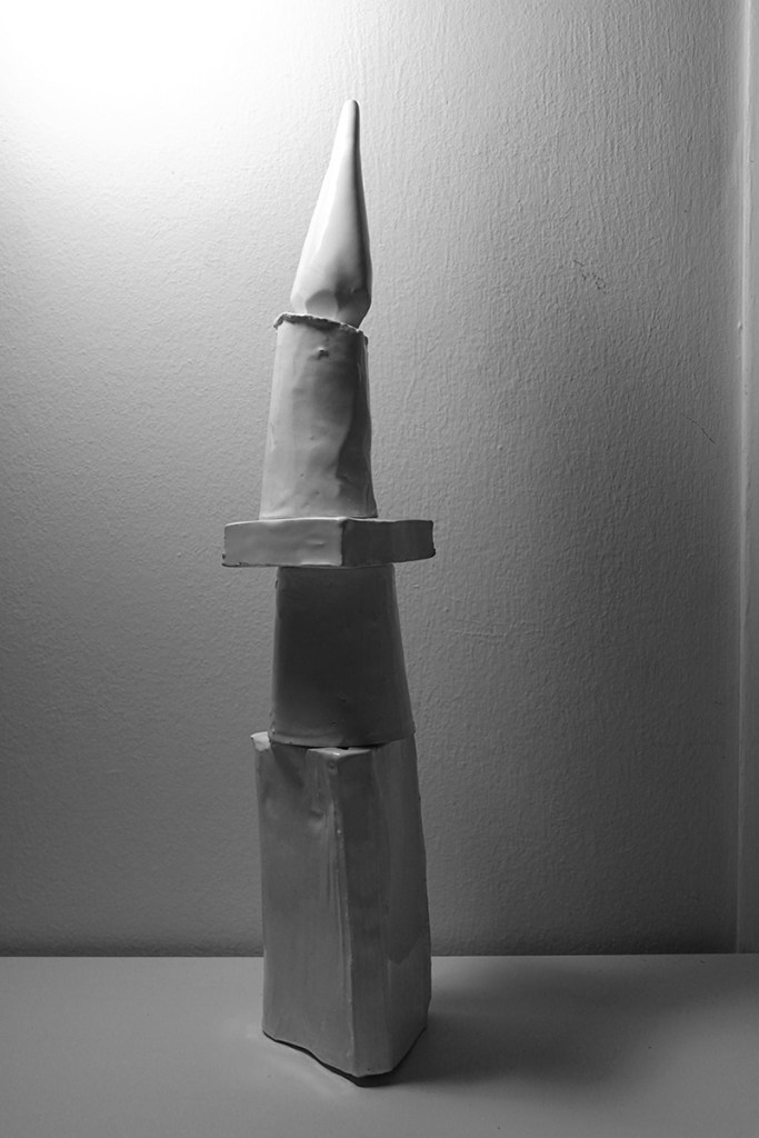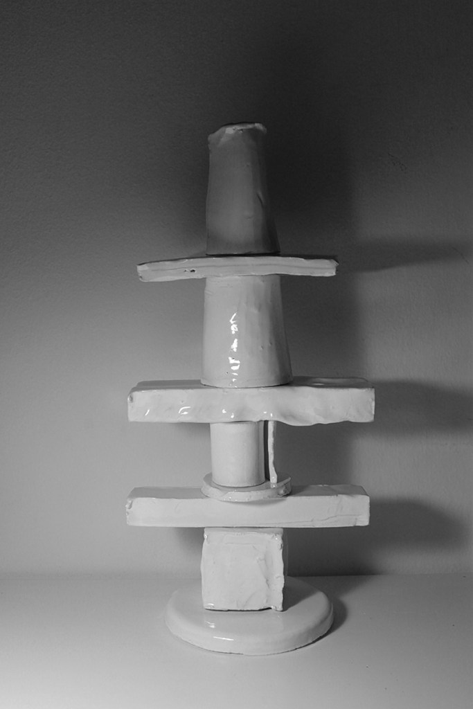 “Floating Castle” is a cluster of nine articulated sculptures. Every sculpture consists of a number of combined ceramic units. They are created in common by Vassilis and Kostas. In the exhibition Ivory Towers they are presented as one piece that creates a sculptural micro-utopia.