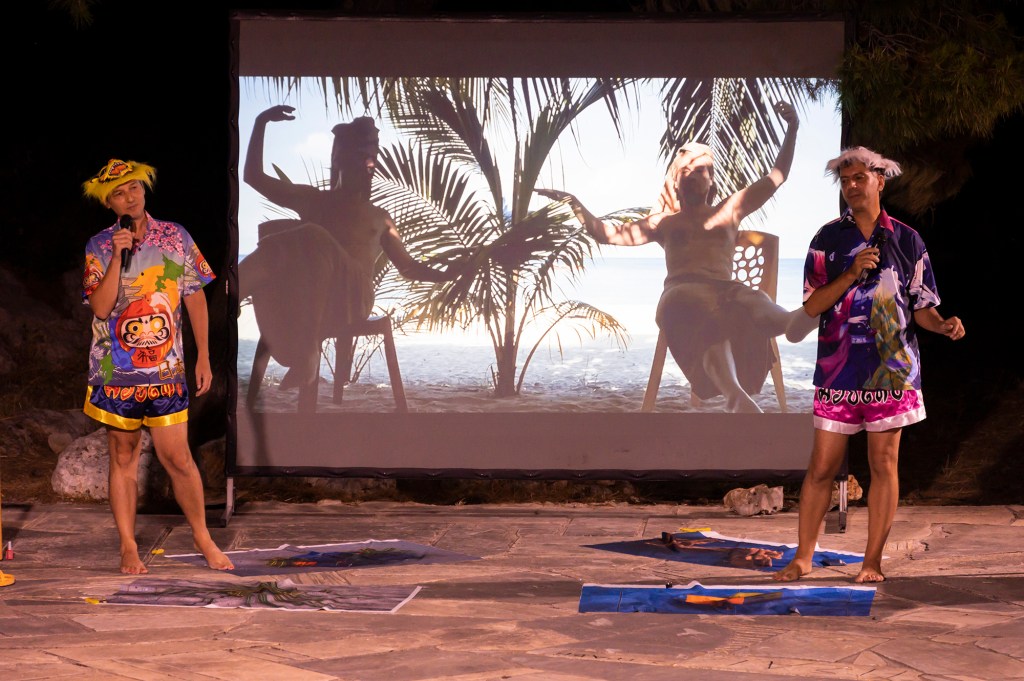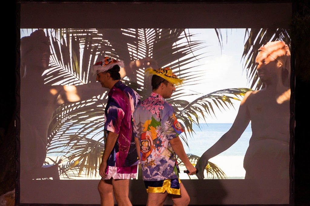 Letters From Tioman Island is a performance that interweaves in a critical and queer mode with the Western tradition of Orientalism, and the pictorial tradition of Odalisques in the Arts. It draws material from personal journeys and multicultural sounds, as well as from 19th century letters or the art of haiku. VASKOS recite letters written by major 19th century artists like Gauguin, Rimbaud, or Flaubert, sent from exotic, oriental places. The performance is in constant dialogue with a video shot in Tioman Island, a tropical island in Southeast Asia, showing staged performances in situ by VASKOS. The artistic duo approaches with mocking delight the stereotypical representations of Orientalism as well as contemporary travel narratives of bliss. VASKOS sway drunkenly, lustfully, guiltily and delightfully together. Through queer strategies and methodologies they assume the hybridity of identity.