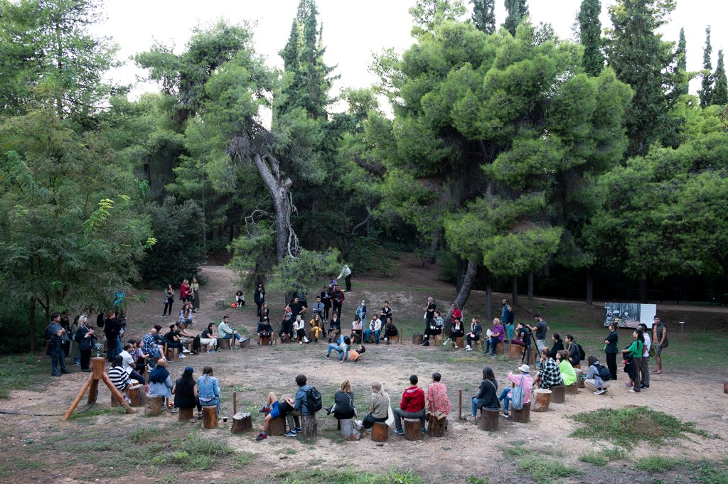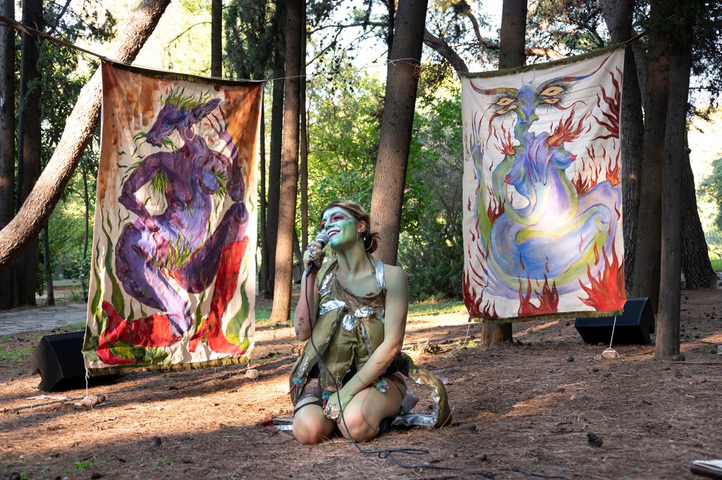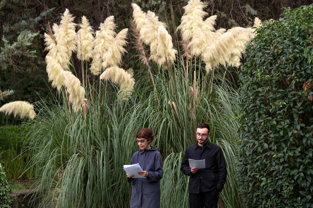 We intended the curation of the public program in the Garden to be such a walk. A hybrid program that engages all the senses. The performances that accompanied the exhibition on the first three days, served as secret guides to sensory stimuli, as well as indicators of an expansive experience of the garden. We consciously invited artists from different fields: storytelling, visual arts, poetry, dance, performative lecture, experimental music. We subconsciously hoped for an internal osmosis of arts and environment, a hybrid awaking of multiple senses.