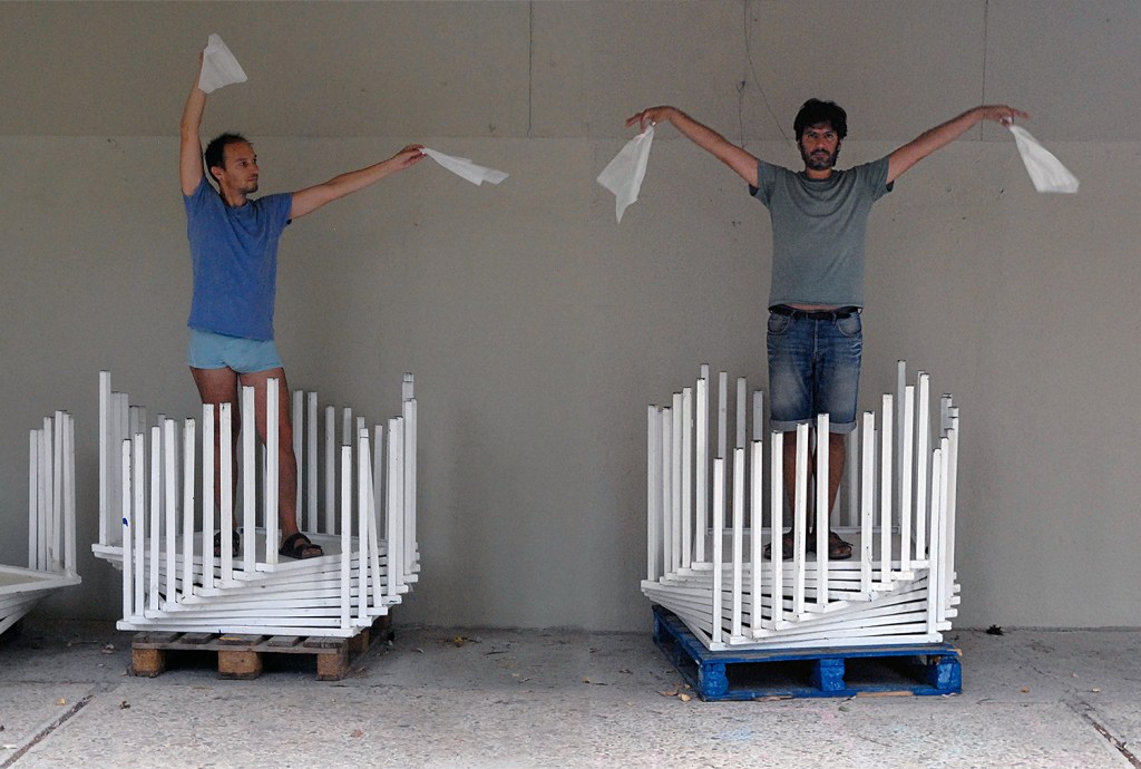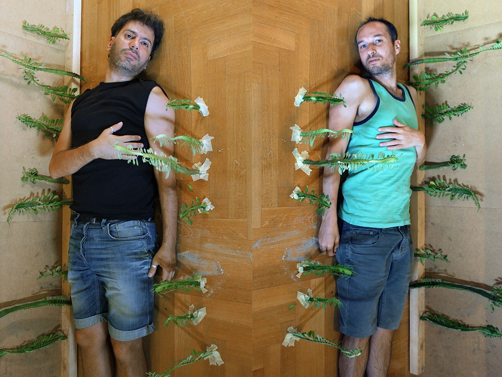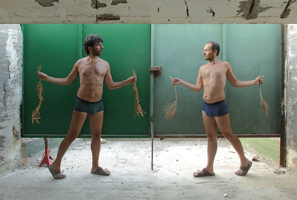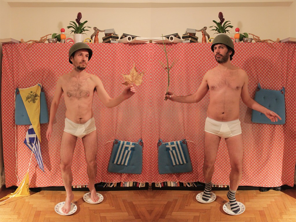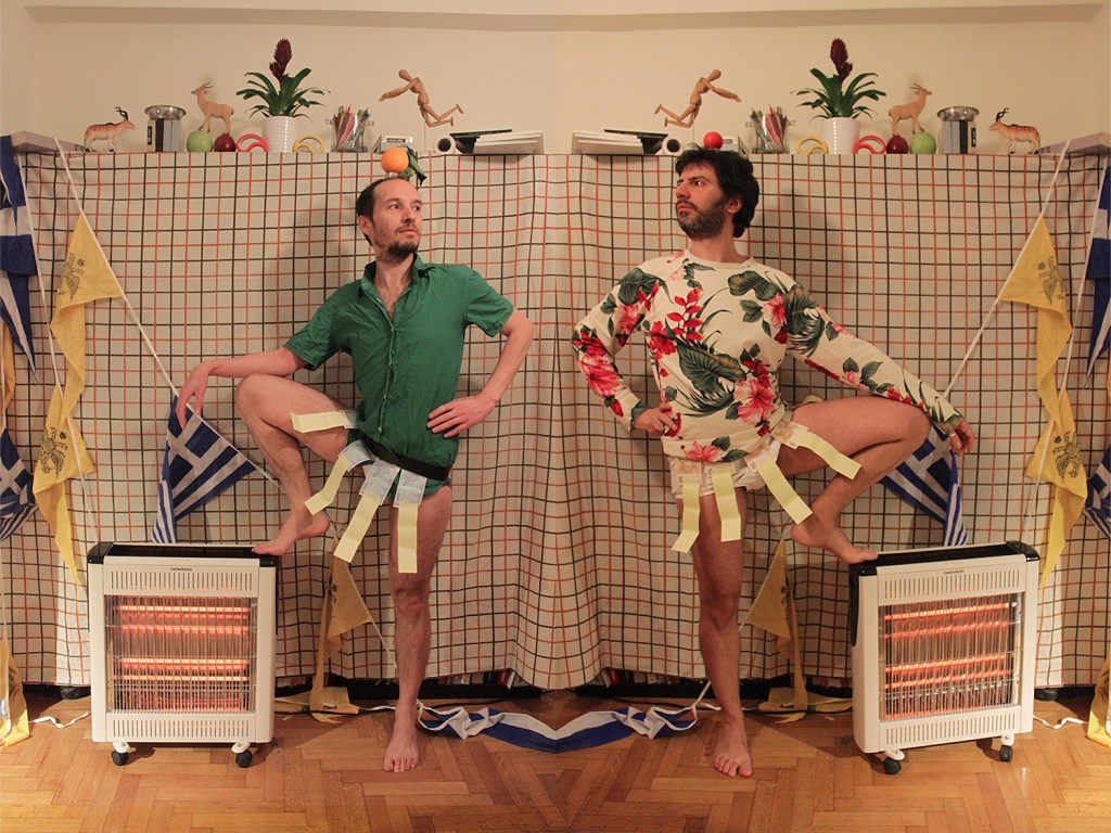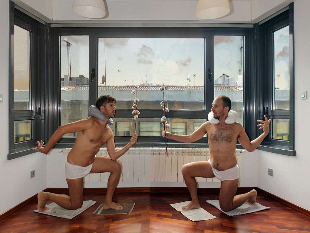 You Are My Mirror is a series of staged photographic diptychs that derive from the joy of artistic coexistence and sharing creativity – a celebratory and cherishing feeling of the everyday experience. The sense of care and responsibility for one another, and by extension the demand for equity and fairness inspire this project. VASKOS try looking upon the ‘artistic duo’ as a contemporary artistic practice, a conscious choice that offers an alternative model of artistic symbiosis and complicity, testing the limits of the traditional identity and the common singularity/oneness of the subject. They create hybrid environments somewhere between reality and fiction. You Are My Mirror series has references in history of art, and in queer and DIY aesthetics ; it is a game of identities and roles that plays with mirror images and reflections and is often infused with homoeroticism.